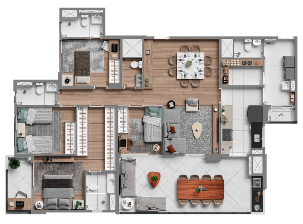 Plantas elegantes: Apartamentos de 4 dormitórios, com metragens de 141 m², projetados para atender às suas necessidades e desejos.