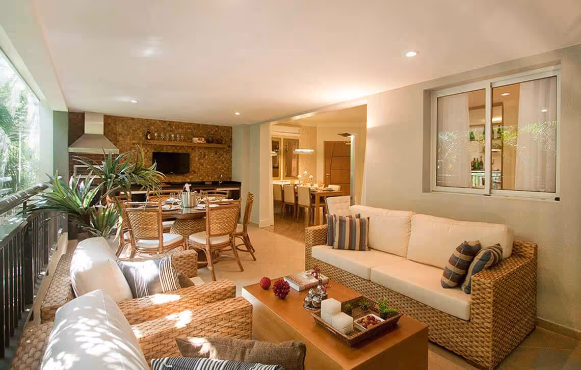 “O tamanho da varanda possibilitou a criação de um outro espaço social, e os móveis de treliça de madeira dão um ar de área externa.”