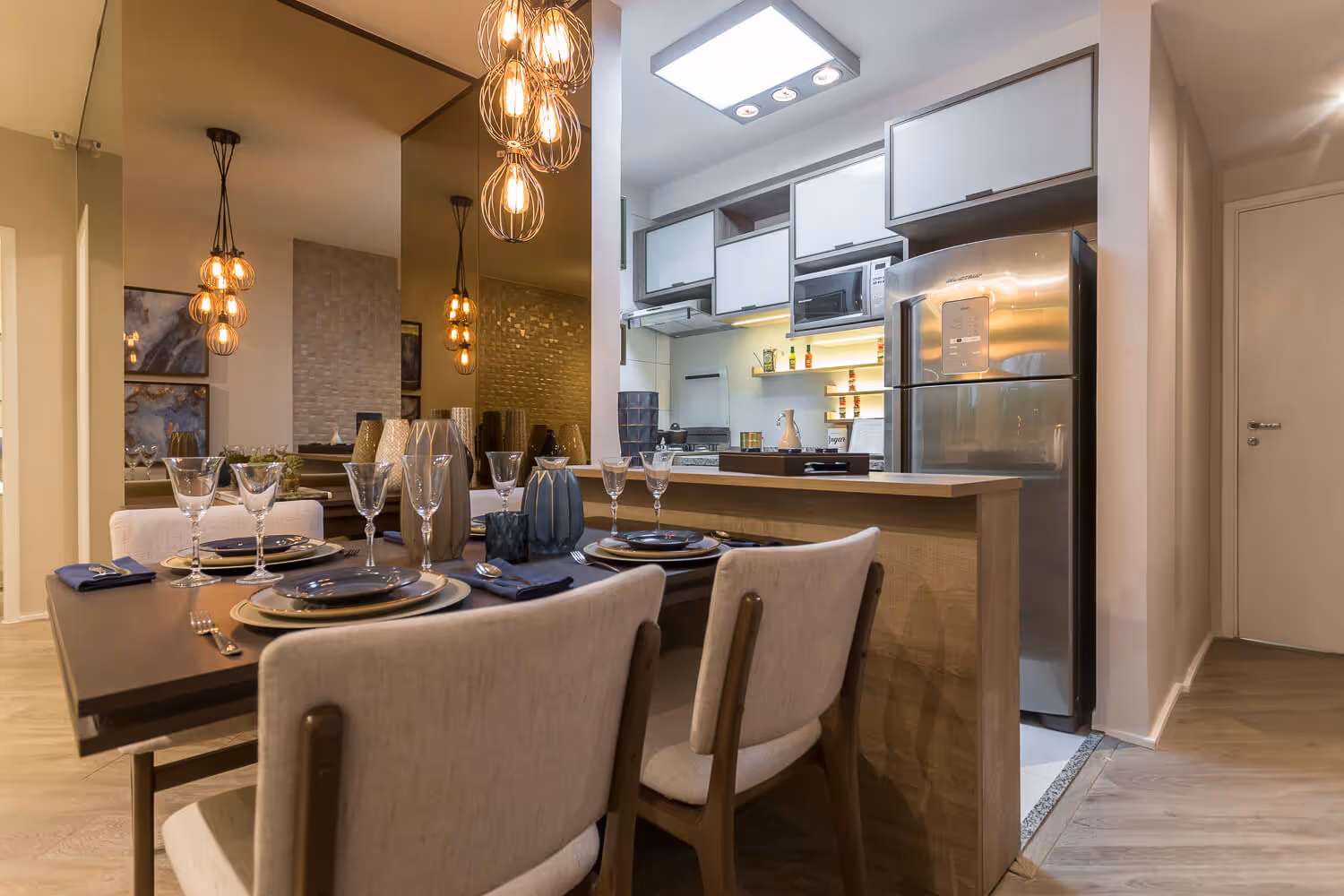 Deve-se mencionar ainda que é permitido combinar luminárias pendentes e embutidas. Em algumas situações, entretanto, a primeira tem primazia. É o caso da mesa de jantar, quando um belo lustre valoriza demais o ambiente. Outra situação que pede as tais luminárias de teto (mas de um modo menos imperativo, só por questão de estilo) é sobre a mesinha de centro. Fazem uma bela companhia com as suas sessões de tevê.
