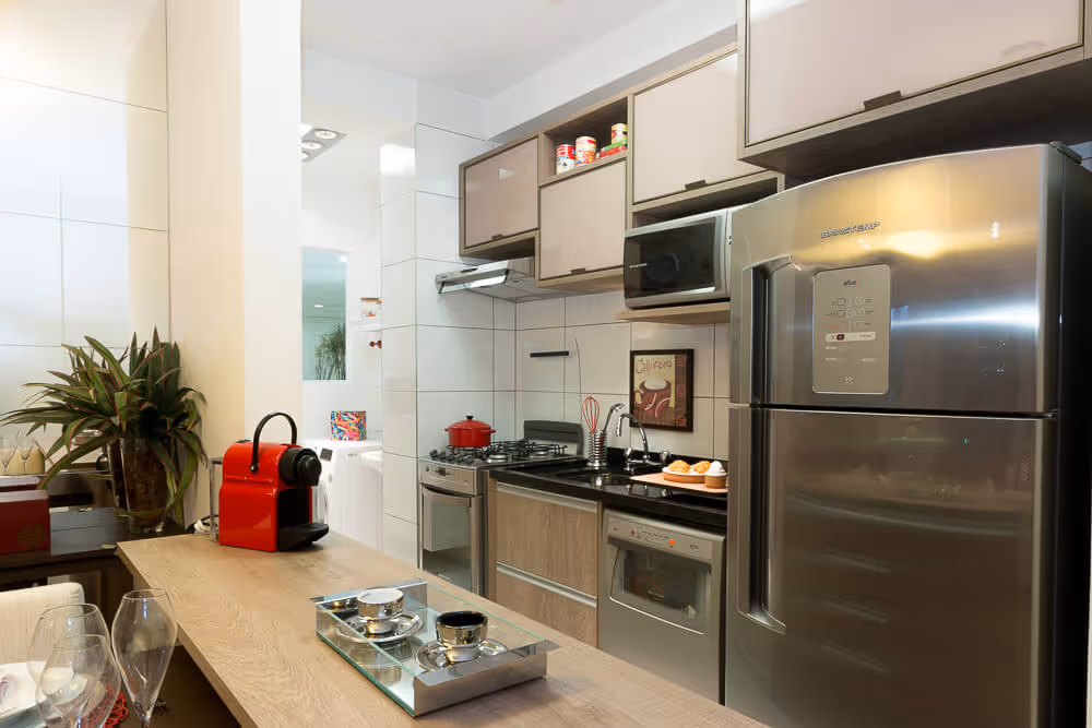 Caso você ainda vá comprar fogão, geladeira, microondas, coifa, atente-se ao tamanho disponibilizado nos móveis ou no projeto da sua cozinha, pois o fato de ter que adaptar os eletrodomésticos, pode fazer com que você tenha menos opções de compra e, muitas vezes, tenha que desembolsar uma verba maior para isso.