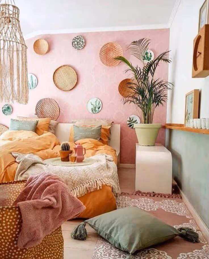 Nas paredes, a sobriedade perde espaço para a profusão de objetos: quadros com motivos étnicos, enfeites de estilo oriental e muitos vasos de plantas. Nesse caso, pode-se também optar por uma superfície neutra, deixando a cor a cargo somente dos objetos decorativos (e demais elementos do ambiente), ou usar uma paleta mais viva para dar um destaque no cômodo. O risco de se usar uma cor marcante na parede é se cansar dela em pouco tempo, mas isso é compensado pelo ganho estético que o arranjo oferece.
